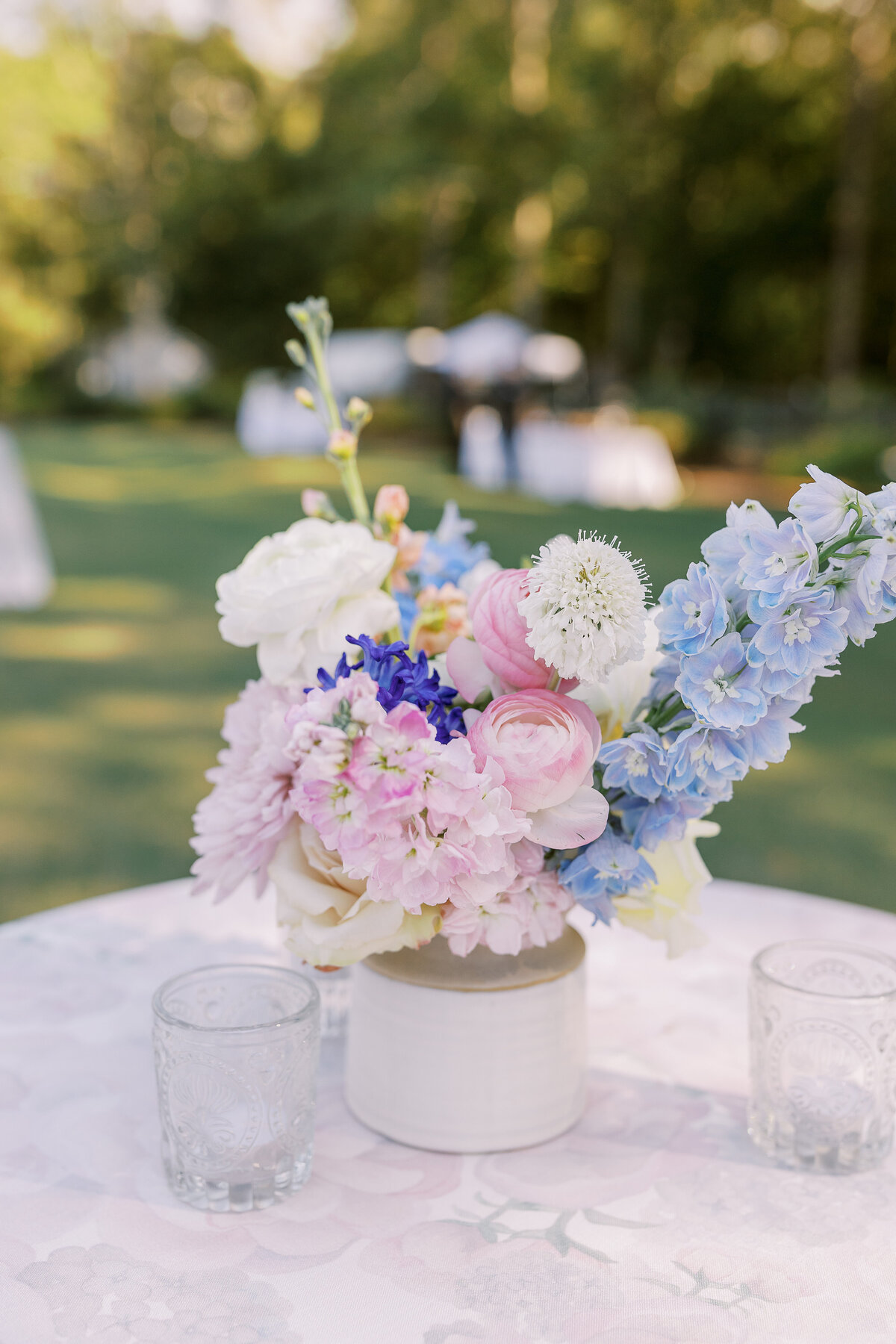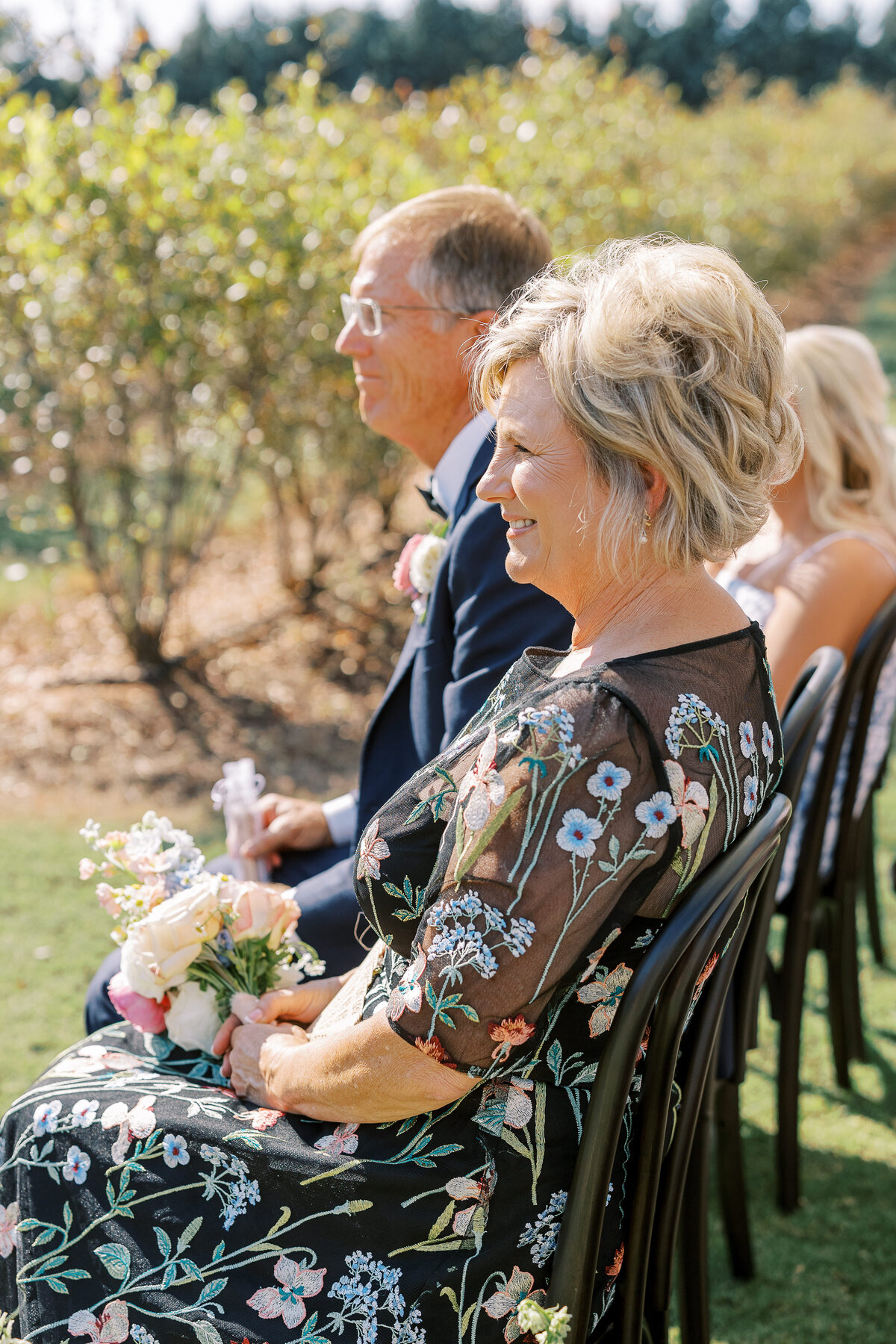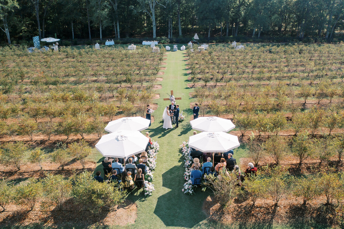 Blending soft color hues with pops of deep pink (because Ali + her mom kept saying they were "pink girls" who loved pops of pink), we played on the grounds natural beauty. They opted for a small, intimate ceremony with just family, and then invited friends to join in the cocktail style reception. Simple yet stunning elegance prompted the reception design, with beautiful patterned linens, cozy soft seating, and a statement bar set up. The garden umbrellas went from providing shade to lighting the guests pathway through the blueberry rows, and the vibes were immaculate.